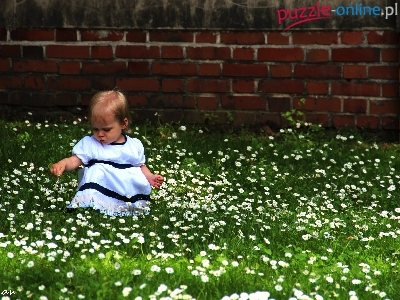 Dziewczynka, Stokrotki, Cegły, Trawa, Mała, Sukienka, Mur