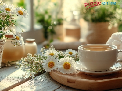 Stokrotki, Herbata, Filiżanka, Taca, Ręcznik, Okno, Kompozycja, Kwiaty, Stół