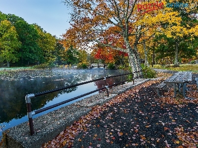 Park, Stół, Staw, Mostek, Jesień, Liście, Ławki