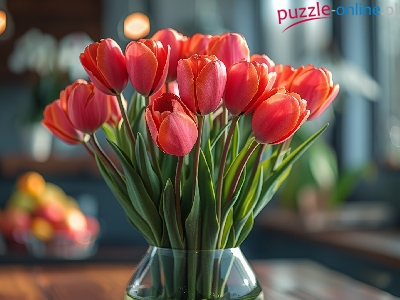 Stół, Rozmyte tło, Wazon, Bukiet, Czerwone, Szklany, Kwiaty, Tulipany