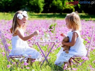 Puzzle Stolik, Łąka, Dziewczynki, Herbatka