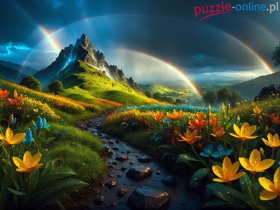 Drzewa, Grafika, Kamienie, Skały, Tęcza, Kwiaty, Góry, Strumień