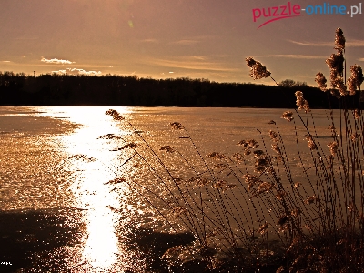 Sucha, Zachód Słońca, Zamarznięte, Jezioro, Trzcina