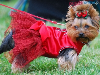 Puzzle sukienka, Yorkshire Terrier, czerwona, kokardka