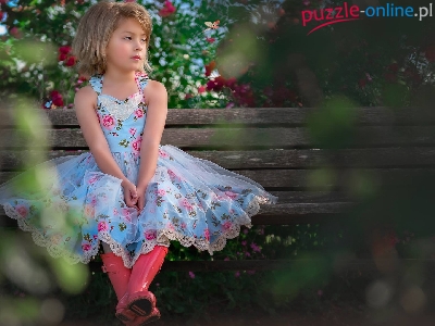 Sukienka, Ławka, Dziecko, Dziewczynka, Kalosze
