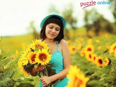 Sukienka, Kobieta, Słoneczniki, Zamyślona, Turkusowa, Kapelusik