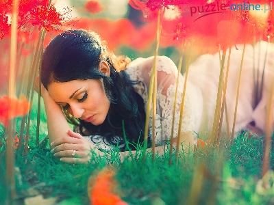 Suknia, Brunetka, Kwiaty, Kobieta, Białą, Czerwone