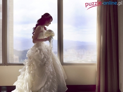 Suknia biała, Okna, Kobieta, Ślub, Bukiet