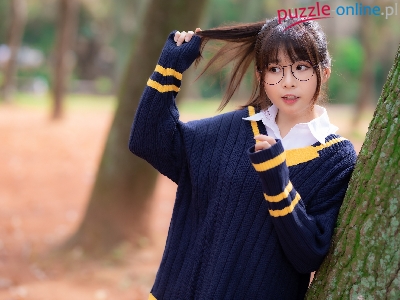 Dziewczyna, Sweter, Azjatka, Drzewa, Okulary