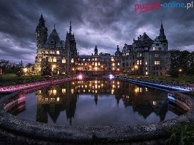Fontanna, Polska, Pałac, Światła, Moszna, Opolskie, Zmierzch