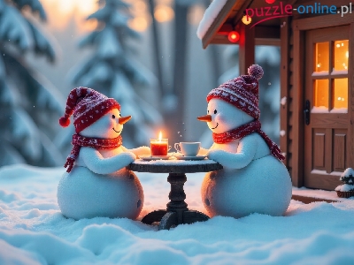Świeca, Zima, Dom, AI, Szaliki, Śnieg, Dwa, Stolik, Czapki, Bałwanki