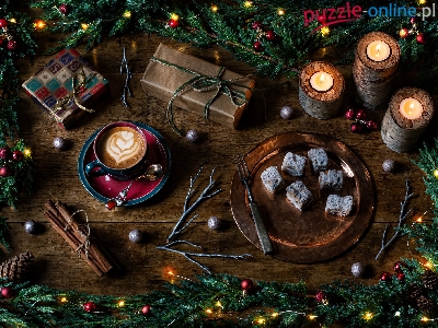 Świece, Boże Narodzenie, Kompozycja, Gałązki, Prezent, Filiżanka, Ciasto, Światełka, Kawa