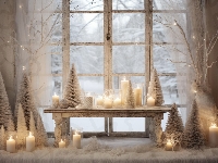 Świeczki, Choinki, Zapalone, Okno, Światełka, Świąteczne, Boże Narodzenie, Ława