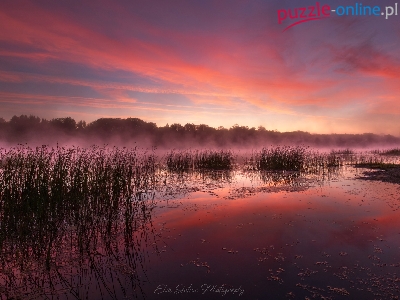 Jezioro, Mgła, Trawy, Świt, Wschód słońca