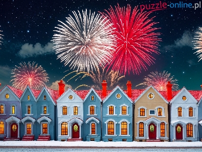 Kolorowe, Sylwester, Domy, Grafika, Fajerwerki