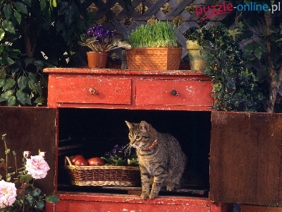 Puzzle Szafka, Kot, Stara, Kwiaty