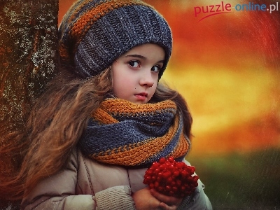 Szalik, Zimowa, Drzewo, Dziewczynka, Czapka, Jarzębina