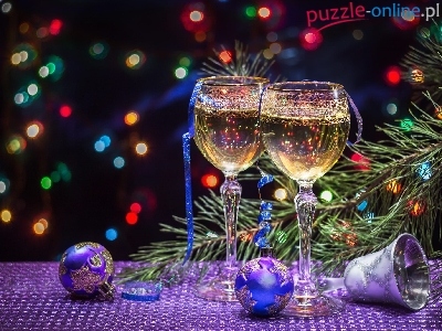 Bombki, Gałązki, Dwa, Kieliszki, Sylwester, Dzwonek, Kompozycja, Światełka, Szampan