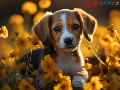 Leżący, Szczeniak, Pies, Kwiaty, Spojrzenie