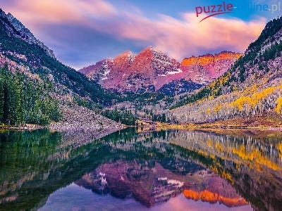 Stan Kolorado, Jezioro Maroon, Odbicie, Szczyty Maroon Bells, Stany Zjednoczone, Góry, Drzewa
