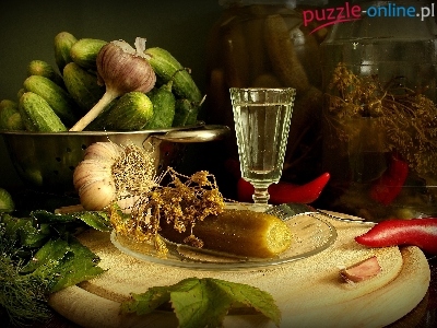 Ogórki, Szklanka, Taca, Papryka, Kompozycja, Czosnek, Drewniana