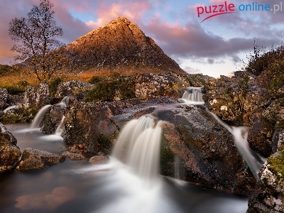 Szczyt Buachaille Etive Mor, Rejon Highland, Szkocja, Dolina Glen Coe, Rzeka Coupall, Roślinność, Chmury, Góra, Skały