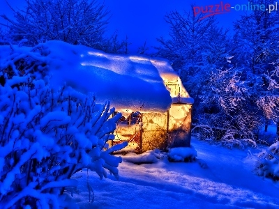 Szopa, Zima, Góra, Oświetlona, Drzewa