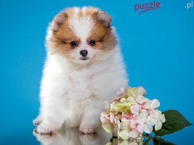 Puzzle Szpic, Pies, Szczeniak, Kwiaty