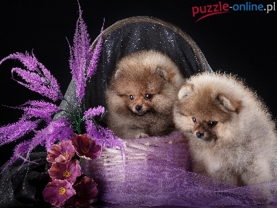 Szpice miniaturowe, Kwiaty, Słodkie, Szczeniaki, Koszyk