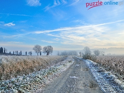 Szron, Drzewa, Droga, Pola, Mgła