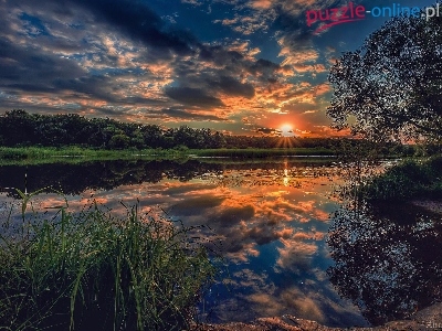 Puzzle Szuwary, Zachód słońca, Jezioro, Drzewa
