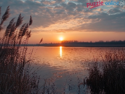 Niebo, Trawa, Jezioro, Szuwary, Zachód słońca, Drzewa