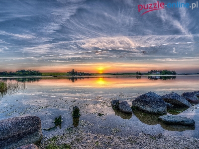 Szuwary, Słońca, Jezioro, Kamienie, Wschód