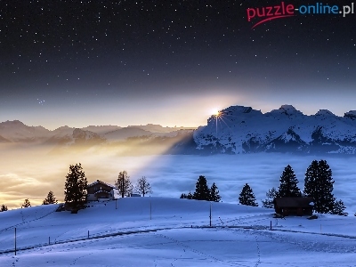 Drzewa, Szwajcaria, Alpy, Promienie, Góry, Domy, Słońca, Zima