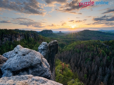 Skały, Niemcy, Drzewa, Chmury, Góry Połabskie, Park Narodowy Saskiej Szwajcarii, Wschód słońca