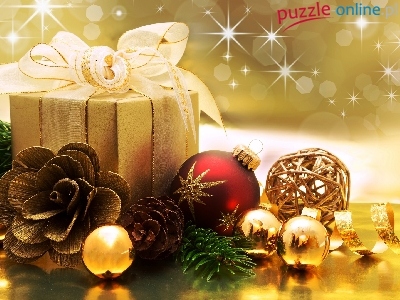 Świąteczna, Bombki, Wstążka, Prezent, Kompozycja, Boże Narodzenie, Szyszki