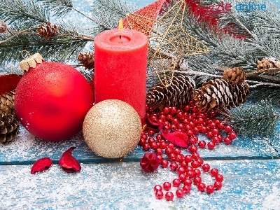 Boże Narodzenie, Ozdoby, Gałązki, Bombki, Świeca, Kompozycja, Czerwona, Szyszki