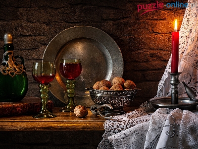 Taca, Butelka, Stół, Książka, Miska, Świeca, Firanka, Kieliszki, Orzechy