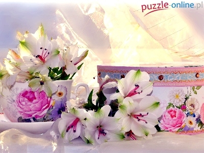 Filiżanka, Tiulowa, Kompozycja, Szkatułka, Alstremeria, Kwiatowa, Tkanina