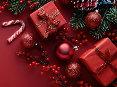 Tło, Boże Narodzenie, Czerwone, Prezenty, Bombki, Jagody, Gałązki, Szyszki