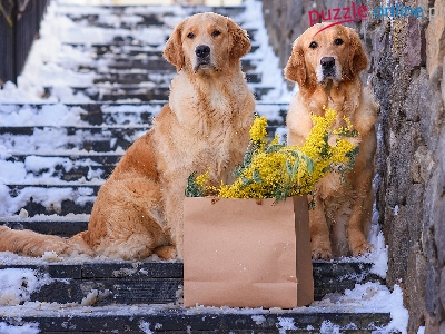 Schody, Dwa, Ośnieżone, Kwiaty, Golden retrievery, Psy, Torebka