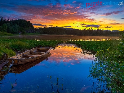 Jezioro, Trawa, Chmury, Zachód, Odbicie, Łódka, Słońca, Drzewa