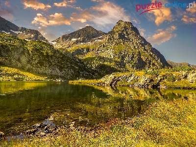 Góry, Trawa, Jezioro, Chmury, Niebo