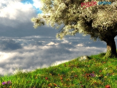 Puzzle Trawa, Drzewo, Kwiaty, Chmury