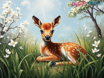 Drzewo, Sarna, Sarenka, Trawa, Grafika, Kwiaty