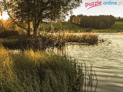 Puzzle Drzewa, Trawa, Promienie słońca, Rzeka