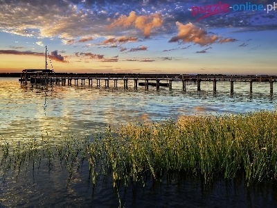 Puzzle Trawa, Molo, Jezioro, Zachód słońca