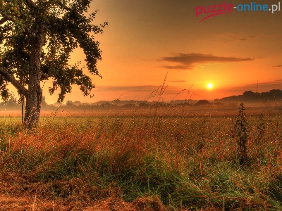 Trawy, Słońca, Drzewo, Łąka, Zachód