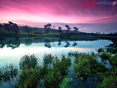 Trawy, Słońca, Jezioro, Drzewa, Zachód