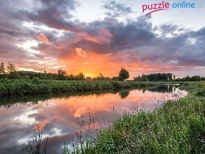 Trawy, Zachód słońca, Rzeka, Drzewa, Chmury
